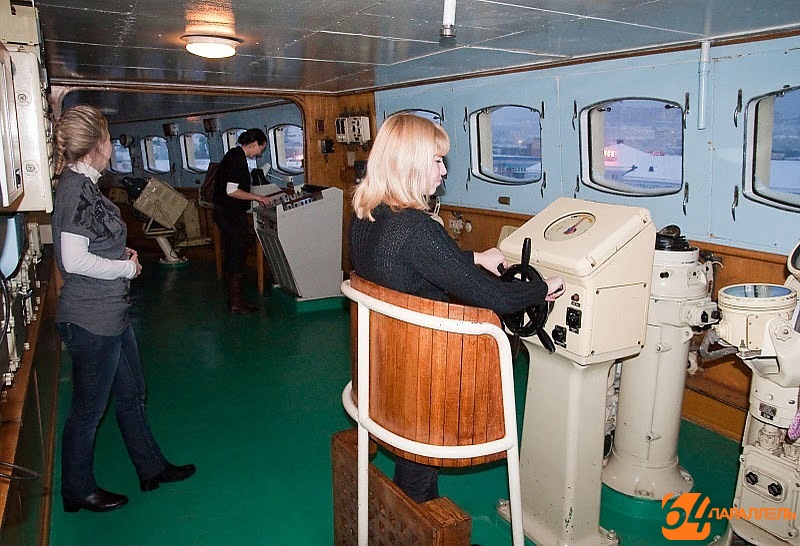 Нас познакомили с командой и провели по всему ледоколу, побывали мы и в машинном отделении, и в реакторном отсеке, и на капитанском мостике, посмотрели на кают-компанию, спортивный зал, бассейн: ледокол может находиться в плавании месяцами, поэтому на его борту есть все, что необходимо для полноценной жизни экипажа.