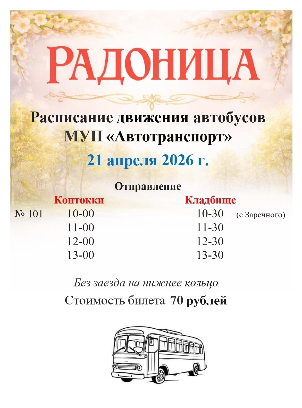 Во вторник, 21 апреля, в день поминовения усопших – на Радоницу – организованы специальные автобусные рейсы до городского кладбища.