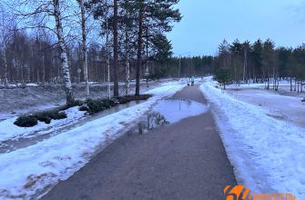 Те, кто ходит в Контокки пешком, наверняка заметили, что пешеходную дорожку залило толстым слоем льда: вода из дренажной трубы настолько поднялась, что частично затопила тротуар, а затем замёрзла.