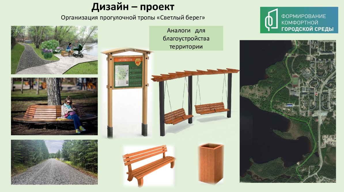планируемая к благоустройству территория расположена в зоне лесопарков и зоне активного отдыха города Костомукша, в пешеходной зоне вдоль озера Контокки. В рамках благоустройства данной территории планируется выполнить следующие виды работ: санитарная очистка леса от поросли территории вдоль освещённой тропы здоровья, отсыпка пешеходной дорожки, устройство велосипедной дорожки, установка скамеек для отдыха, урн, информационных и навигационных стендов, качелей парковых. Благоустроенная прогулочная тропа «Светлый берег» станет притягательным местом для спорта, отдыха и туризма.