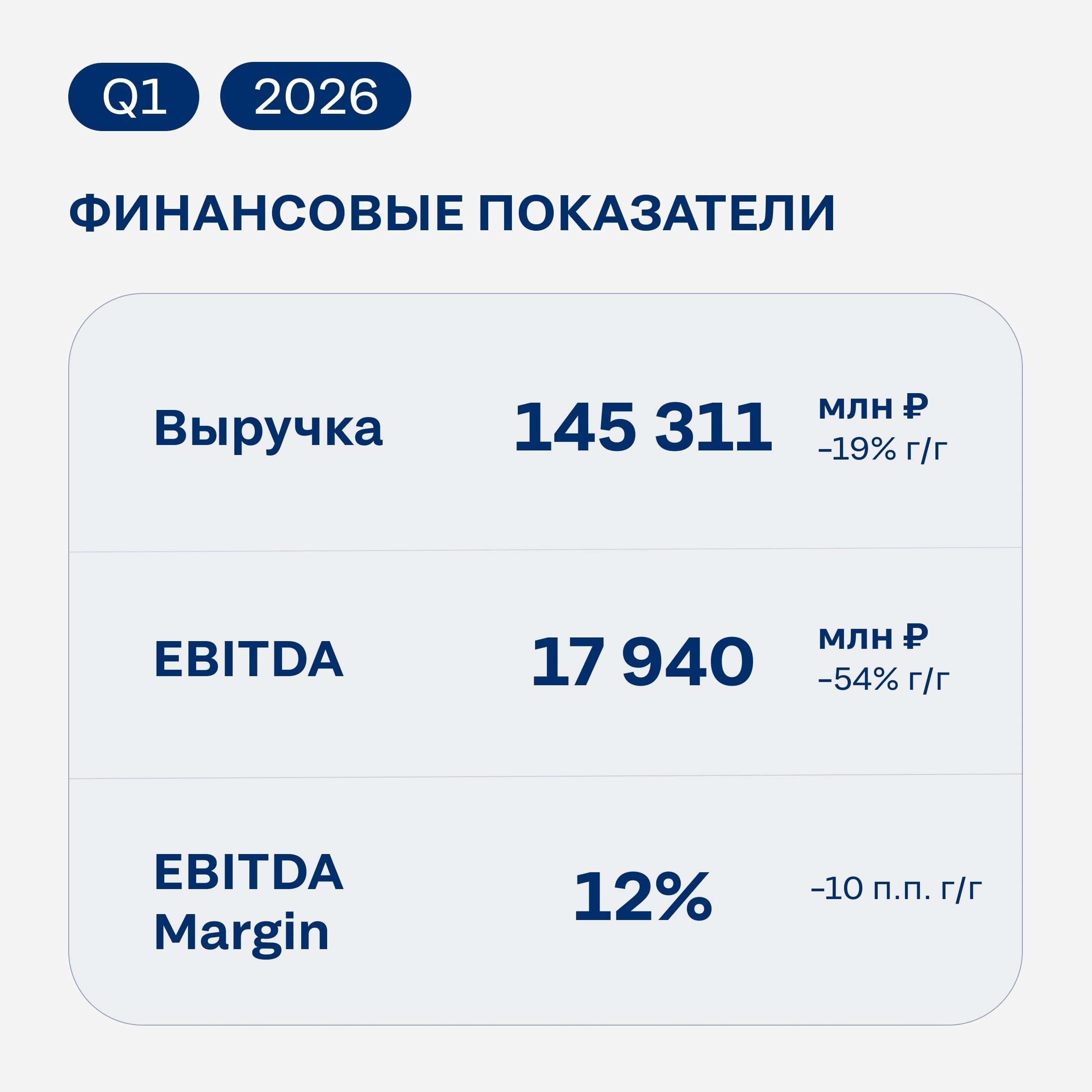 В первом квартале 2026 года выручка снизилась на 19 процентов по сравнению с прошлым годом.