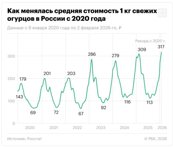Итак, согласно данным Росстата, кило свежих огурцов подскочило в цене с конца декабря 2025 года на 50 процентов, а значит, эти овощи стали самым сильно подорожавшим потребительским товаром среди измеряемых службой.