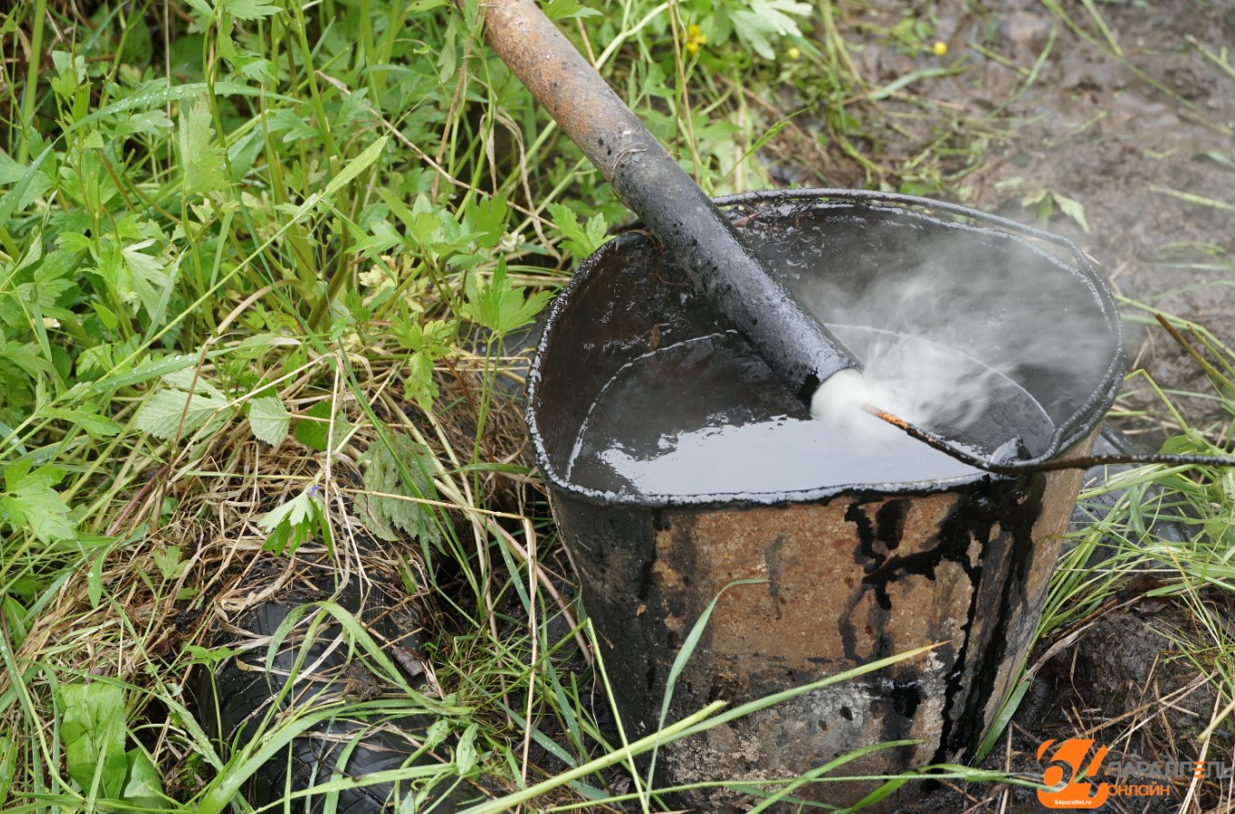 Мы приехали в Вокнаволок в тот момент, когда там начали гнать смолу для обработки будущей лодки. Завораживающее действо, как из дерева под воздействием высоких температур в итоге получилось целое ведро тёмной тягучей смолы. Процесс залипательный, в прямом и переносном смыслах.