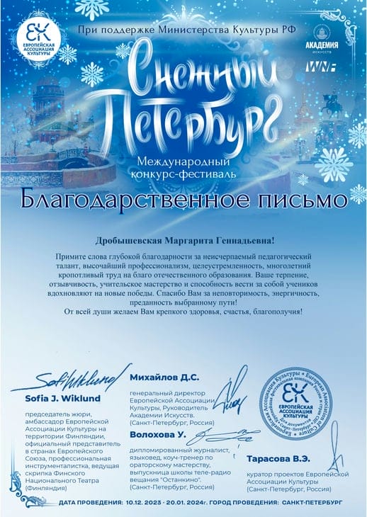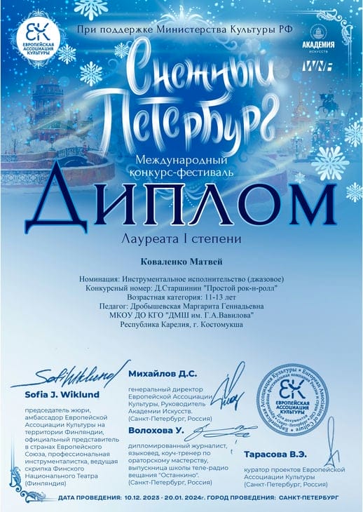 На конкурс в северную столицу выступление Матвея отправила его педагог и наставник Маргарита Дробышевская. По мнению жюри, во время исполнения композиции Матвей полностью погрузился в музыку и получал удовольствие от своей игры, и это было высоко оценено.