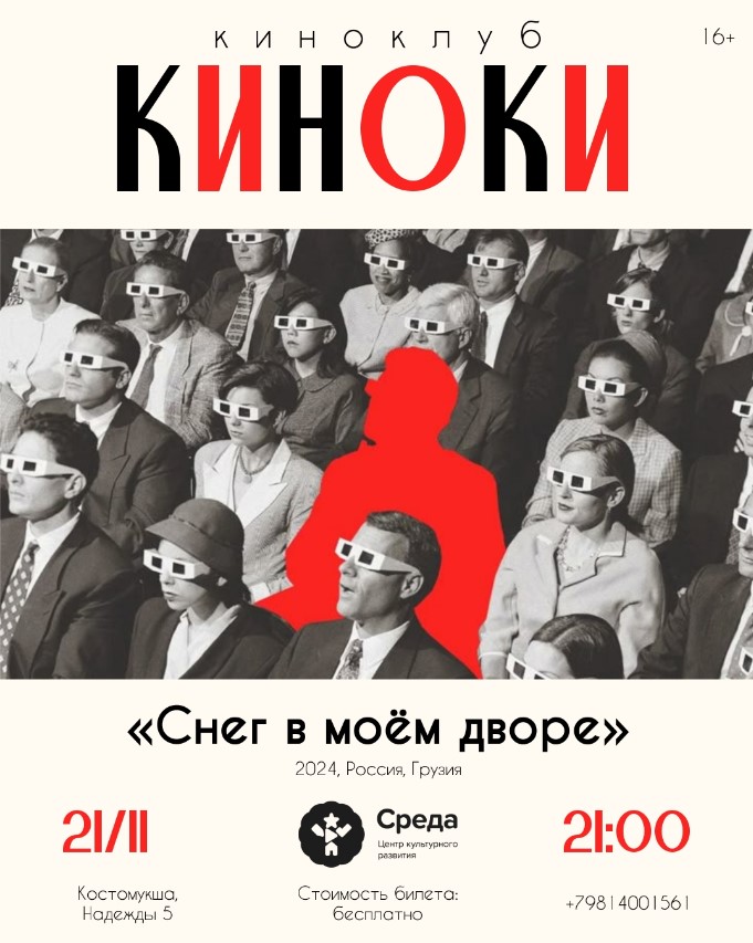 Киноклуб «Киноки» приглашает на показ фильма «Снег в моём дворе» режиссёра Бакура Бакурадзе. Он пройдёт 21 ноября в 21:00 в ЦКР «Среда». После просмотра будет обсуждение картины и встреча с Максимом Горбовым, директором фестиваля молодого кино VOICES и соучредителем прокатной компании «К24». (16+)