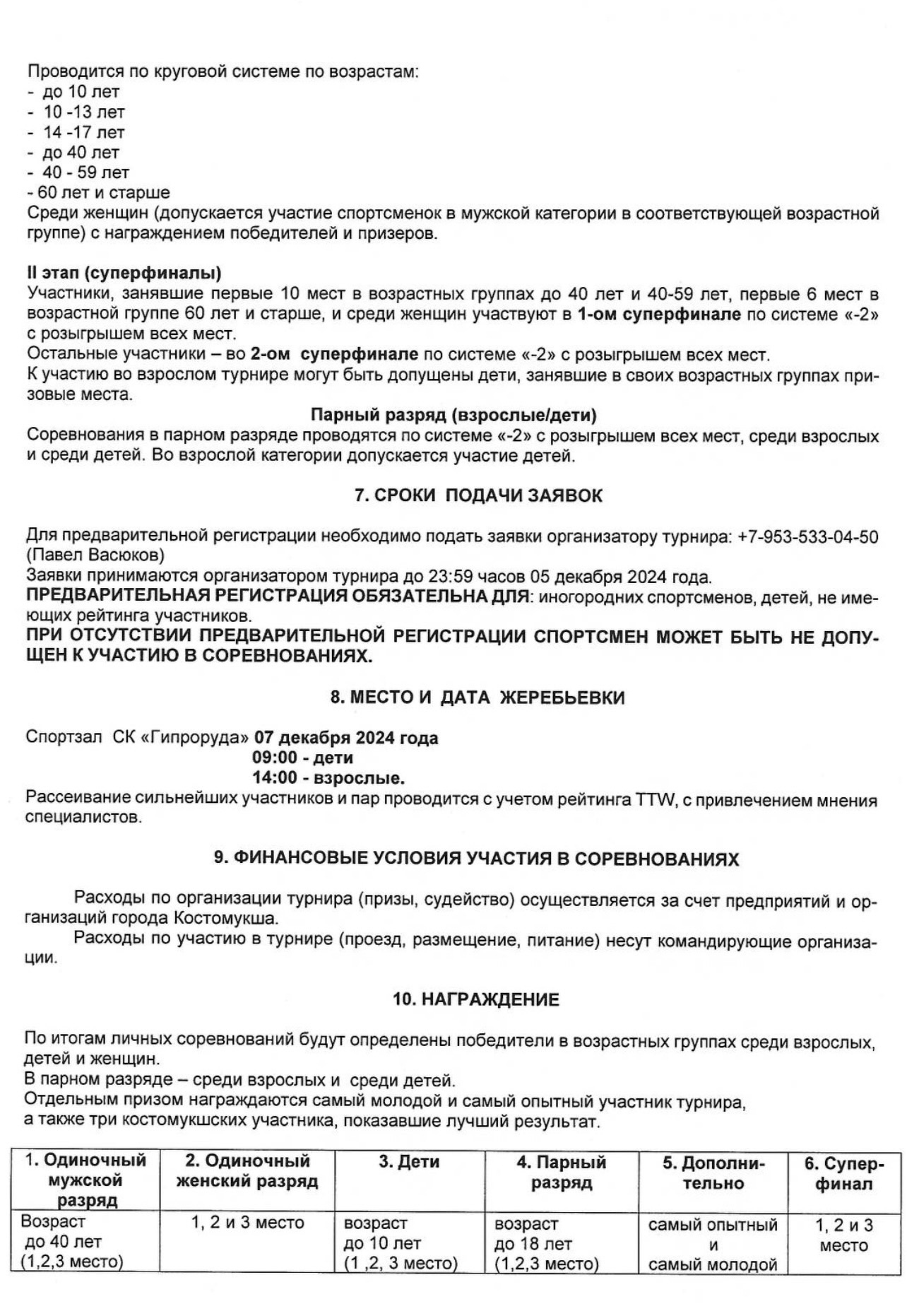 Турнир проводится в одиночном и парном разрядах. Победители будут определены в возрастных группах среди взрослых и детей. Отдельным призом награждаются самый молодой и самый опытный участник турнира, а также три костомукшских спортсмена, показавших лучший результат.