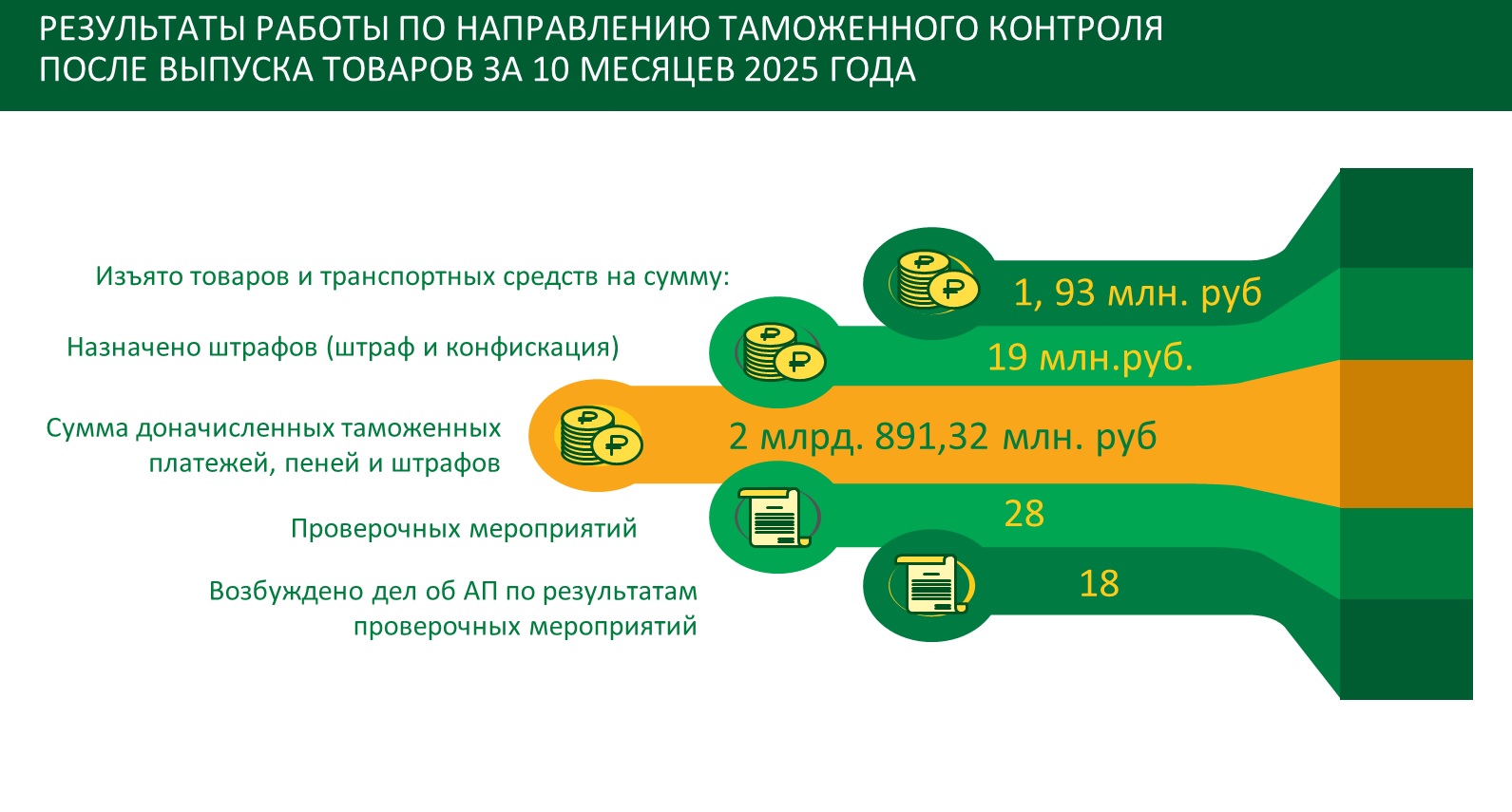 За десять месяцев таможенники рассмотрели 313 дел об административных правонарушениях, по которым назначили наказания в виде штрафов на сумму более 17 миллионов рублей. Чаще всего выявлялись нарушения, связанные с несоблюдением требований при подаче статистических форм учёта перемещения товаров, а также с указанием в декларациях недостоверных сведений о товарах. Такие действия приводили к занижению размера подлежащих уплате таможенных платежей. Помимо этого, дела возбуждались по фактам невывоза транспортных средств, нарушений валютного законодательства и другим правонарушениям.
