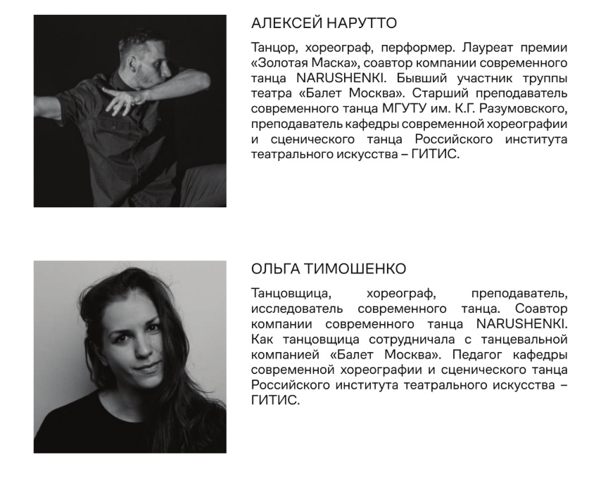 С 2 по 11 сентября хореографы Алексей Нарутто и Ольга Тимошенко (компания NARUSHENKI, педагоги ГИТИС) проведут занятия с местными студийцами.