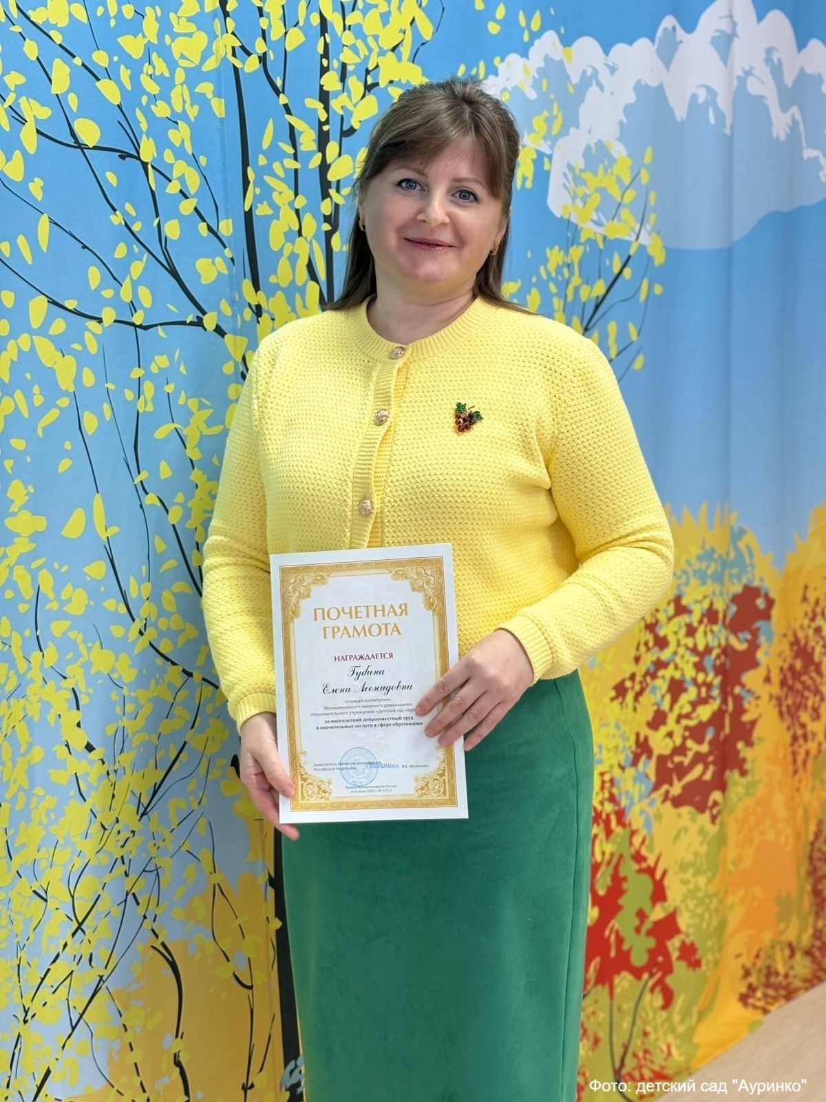 Старшему воспитателю детского сада «Ауринко» Елене Губиной вручили почётную грамоту Министерства просвещения России. Высокая оценка профессиональных качеств и многолетней добросовестной работы педагога стала заслуженным признанием её вклада в развитие дошкольного образования.