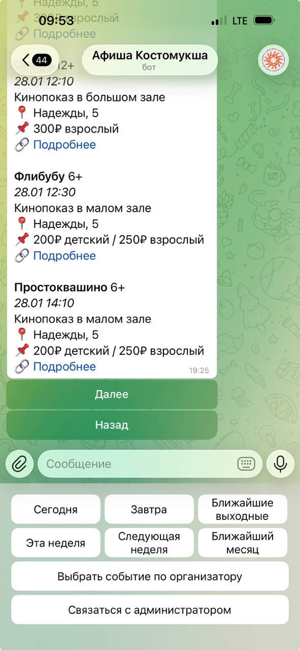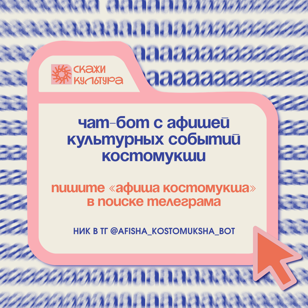 Чтобы воспользоваться чат-ботом, переходите по ссылке: https://t.me/afisha_kostomuksha_bot и следуйте подсказкам, которые увидите в чате.