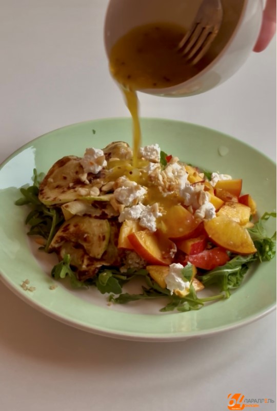 – Из недавних открытий это салат с киноа, кабачками и нектарином. Да, звучит очень необычно, но он очень вкусный и нежный. Тем более сезон кабачков пока не закончился. На две порции нужны киноа (примерно полстакана), средний кабачок, один-два нектарина, рукола, сыр фета или сиртаки, грецкие орехи или семечки. Для заправки понадобятся по одной-две столовой ложке оливкового масла, лимонного сока, по чайной ложке дижонской горчицы и мёда, соль и перец – по вкусу. Заправку замешать в отдельной мисочке, киноа отварить, кабачок нарезать кружочками и обжарить на сковороде до мягкости. Остальные ингредиенты нарезать кубиками. Затем соединить всё в миске, полить заправкой и легонько перемешать.