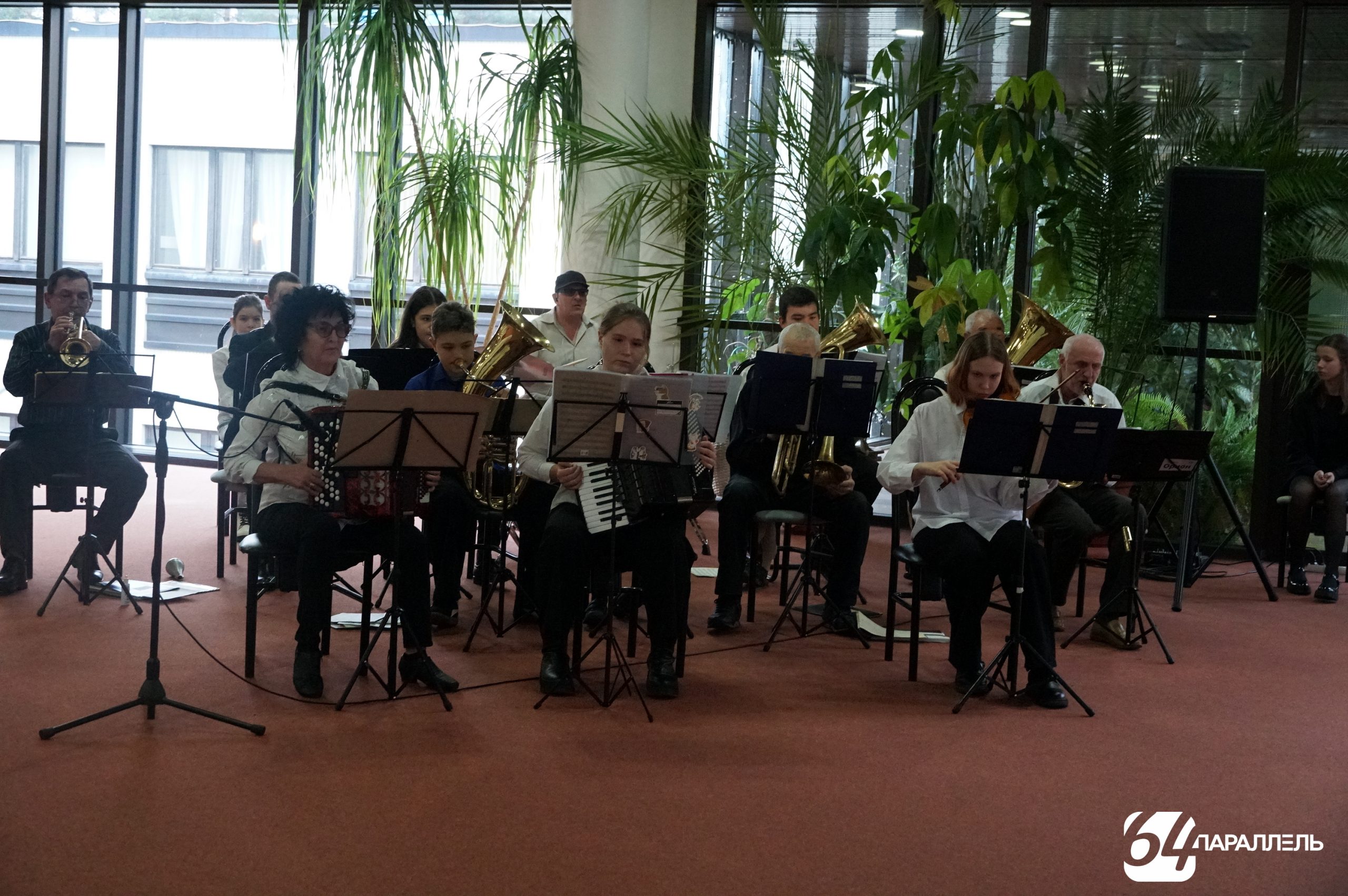 Перед концертом в фойе выступал оркестр «Орион», а «Серебряные волонтёры» и общественная организация «10 регион» представили изделия для фронта.