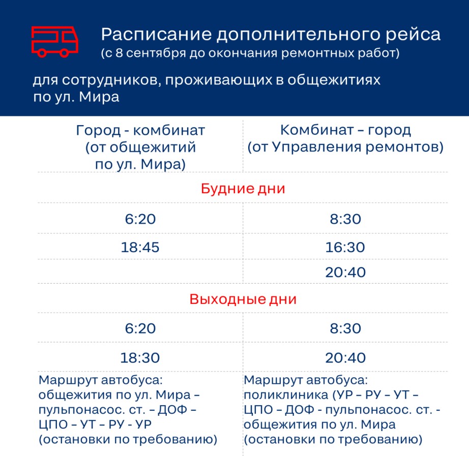 Для сотрудников, проживающих в общежитиях по ул. Мира, временно будет запущен дополнительный рейс.