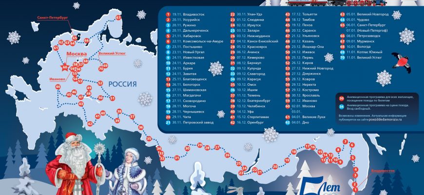 Новогодний состав начинает свой путь 19 ноября с Владивостока. Поезд проедет больше 20 тысяч километров, посетив при этом 70 городов России.