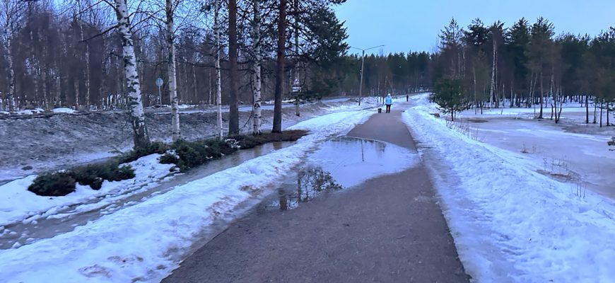 Те, кто ходит в Контокки пешком, наверняка заметили, что пешеходную дорожку залило толстым слоем льда: вода из дренажной трубы настолько поднялась, что
