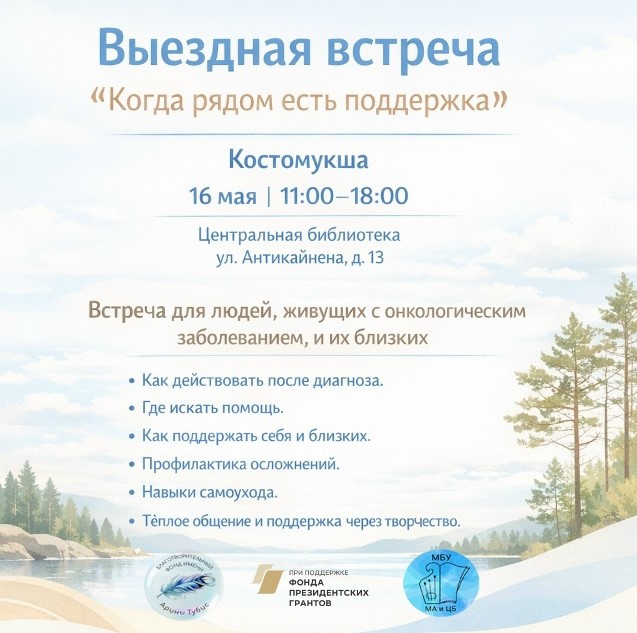 16 мая команда благотворительного фонда имени Арины Тубис проведет в Костомукше выездную встречу для людей, живущих с онкологическим заболеванием, и их близких.
